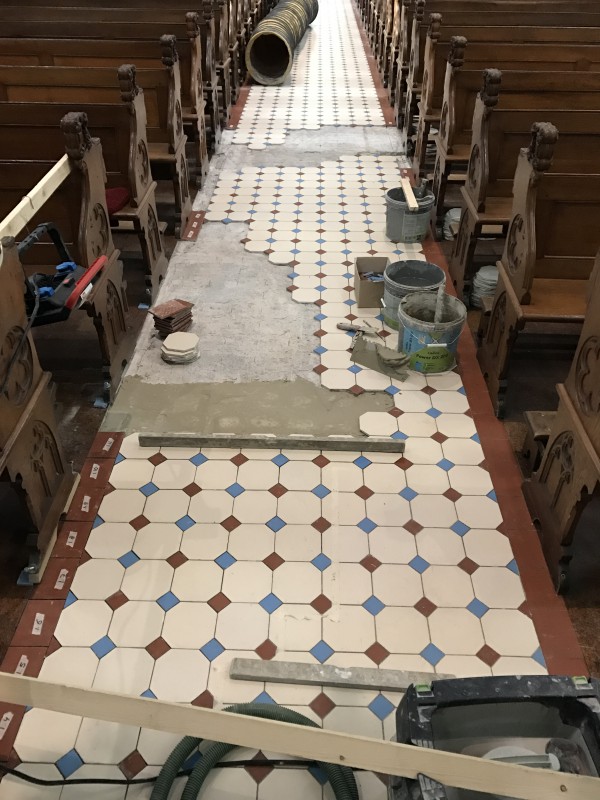 In rijksmonument, de neogotische rk Sint Nicolaaskerk uit 1887 in St. Nicolaasga is door ons restauratiewerk uitgevoerd. Door de tand des tijds losgeraakte vloerdelen zijn zorgvuldig gerestaureerd. Zodat de prachtige, kleurrijke vloer zijn originele aanzicht blijft behouden.